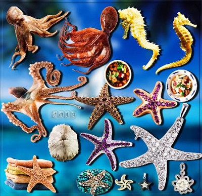 Png формат - Жители моря 203 Png | 2423x1683; 3118х2221 | 300 dpi | 605 Mb Автор: Norton Морские звезды, коньки, медузы, рыбы и другие жители моря, блюда из них на прозрачном фоне в формате Png для программы фотошоп при создании фоторамки